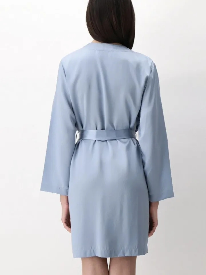 Dieser kurze Seiden-Morgenmantel ist die perfekte Ergänzung zu allen Seiden-Nachtwäschen von Luna di Seta. Der Morgenmantel ist aus Seidensatin aus reiner Seide und hat eine Länge von ca. 100 cm. Die feine Seide fällt elegant und fließend und durch ihre temperaturausgleichenden Eigenschaften ist dieser Morgenmantel sehr angenehm und hautsympathisch. Der kurze Seiden-Morgenmantel hat lange Ärmel und wird mit einem Bindegürtel geschlossen.