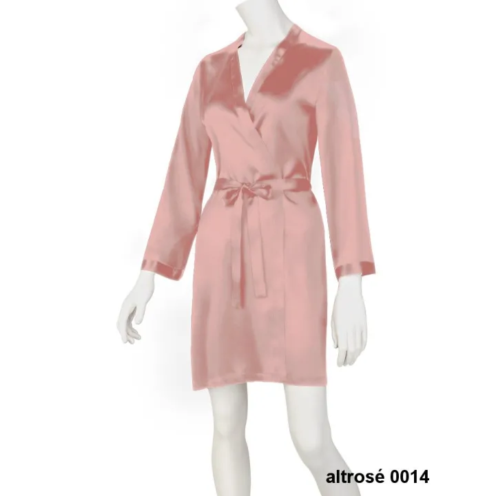 Dieser kurze Seiden-Morgenmantel ist ca. 90 cm lang. Er wird in den Größen 36 bis 46 angeboten (deutsche Damengrößen) und ist in den folgenden Farben erhältlich: