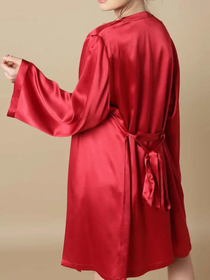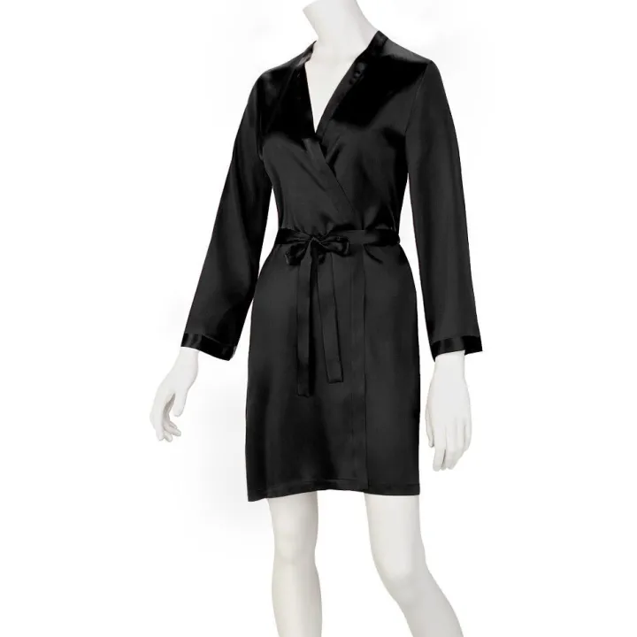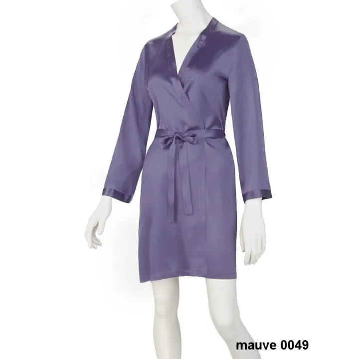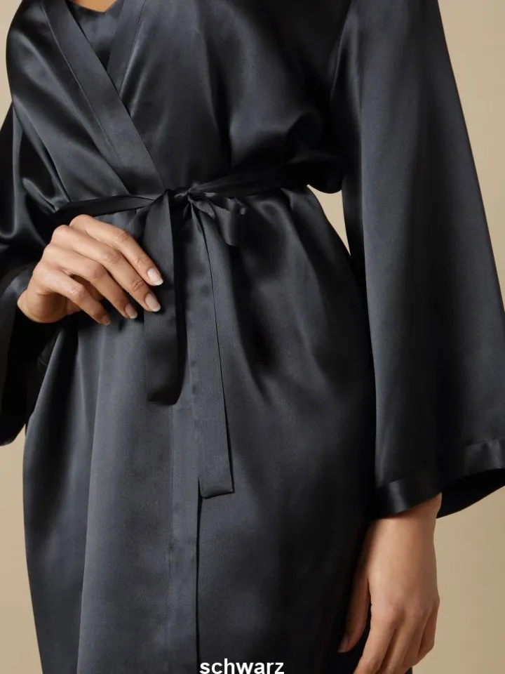 Dieser kurze Seiden-Morgenmantel ist ca. 90 cm lang. Er wird in den Größen 36 bis 46 angeboten (deutsche Damengrößen) und ist in den folgenden Farben erhältlich: