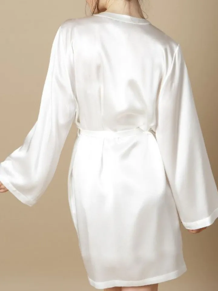 Dieser kurze Seiden-Morgenmantel ist ca. 90 cm lang. Er wird in den Größen 36 bis 46 angeboten (deutsche Damengrößen) und ist in den folgenden Farben erhältlich: