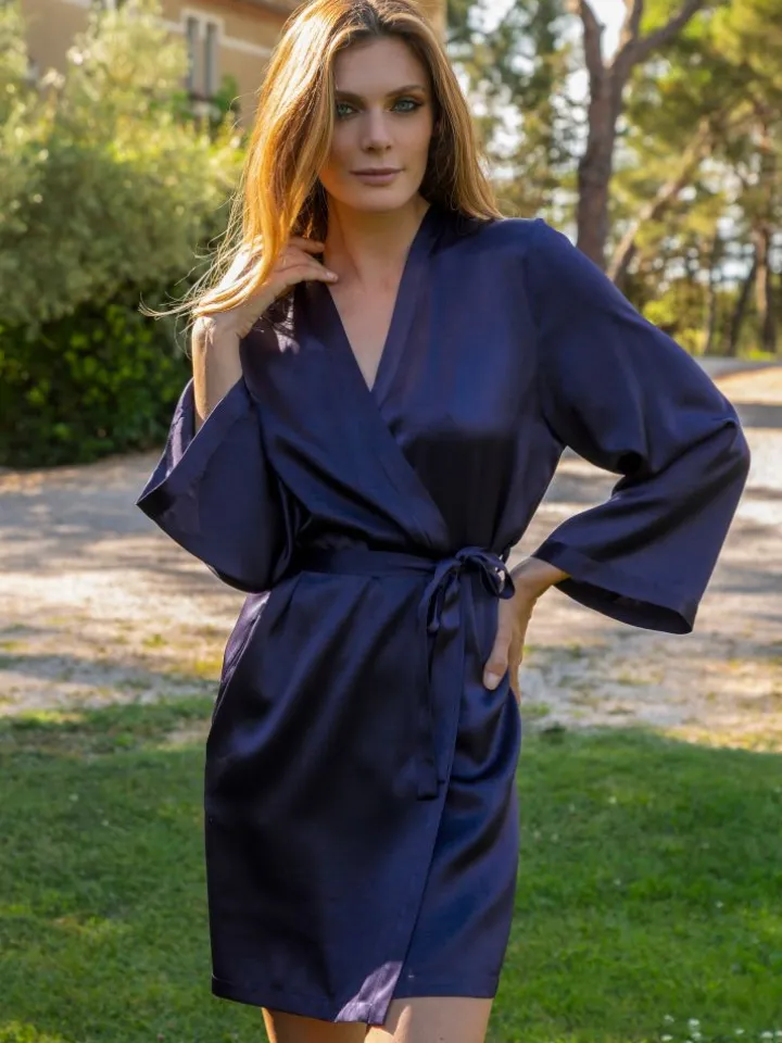 Der kurze Seiden-Morgenmantel Laser der französischen Edel-Marke Marjolaine ist aus feinem Seidensatin (100% Seide) gefertigt. Der hochwertig verarbeitete kurze Morgenmantel ist die perfekte Ergänzung zu den Seiden-Nachthemden und Negligés von Marjolaine.