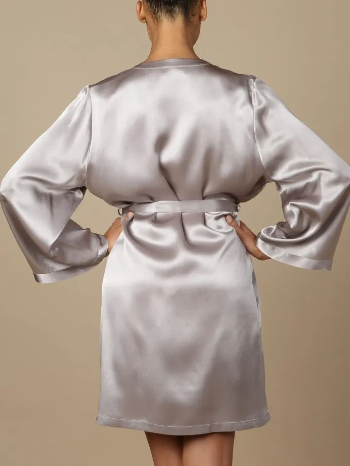 Der kurze Seidenmorgenmantel Laser hat lange Ärmel, ein schmales Revers und wird mit einem Bindegürtel geschlossen. Er ist aus der Basic Kollektion Soie Unie von Marjolaine und in Uni-Farben erhältlich.