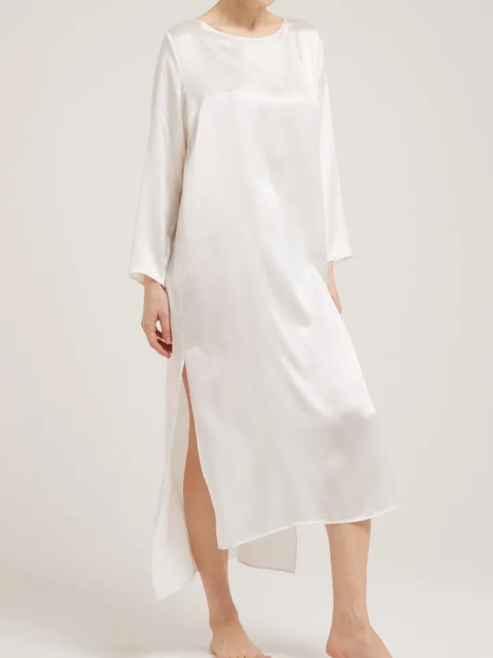 Dieses elegante Seiden-Nachtkleid ist aus hochwertigem Seidensatin (100 % Seide) gefertigt. Das lang geschnittene Seidenkleid ist hinten etwas länger geschnitten als vorne und seitlich auf beiden Seiten hoch geschlitzt. Es ist in klassischen Uni Farben erhältlich, wie z.B. sangria rot, nachtblau oder naturweiss.