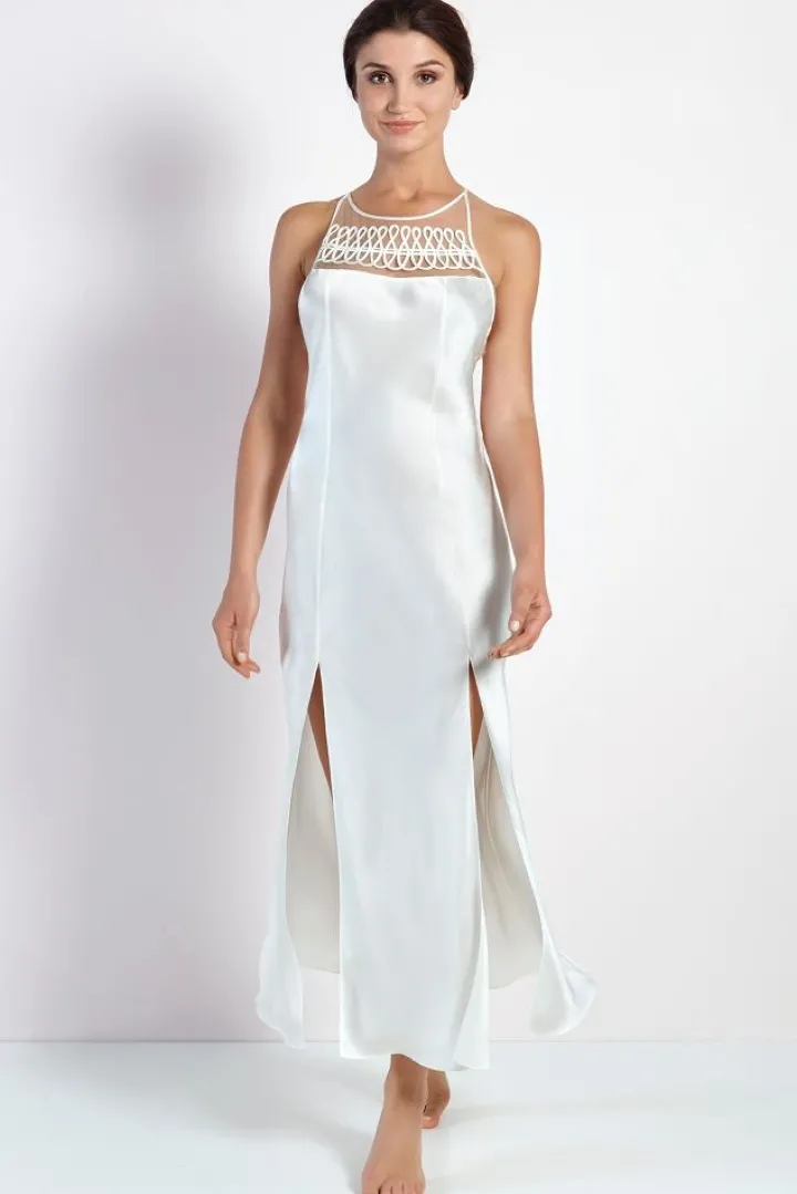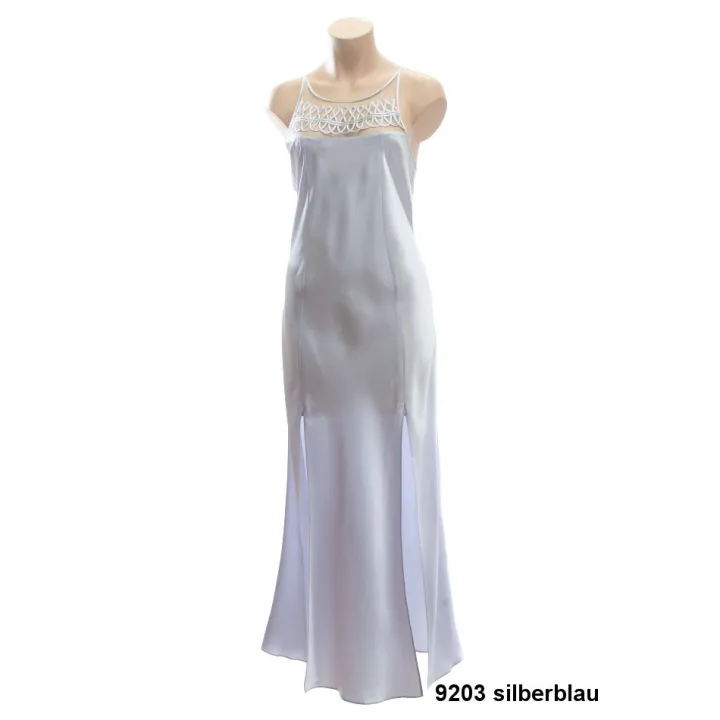Die besonders feinen Spaghetti-Träger sind verstellbar. Auf der Rückseite sind die Träger für einen besseren Tragekomfort gekreuzt. Der tiefe Rückenausschnitt läuft V-förmig zu und der doppelte Schlitz im Saum vorne bietet verführerische Einblicke. Dieses lange Seiden- Negligé hat eine sehr feminine und edle Optik und eine Gesamtlänge von ungefähr 135 cm.