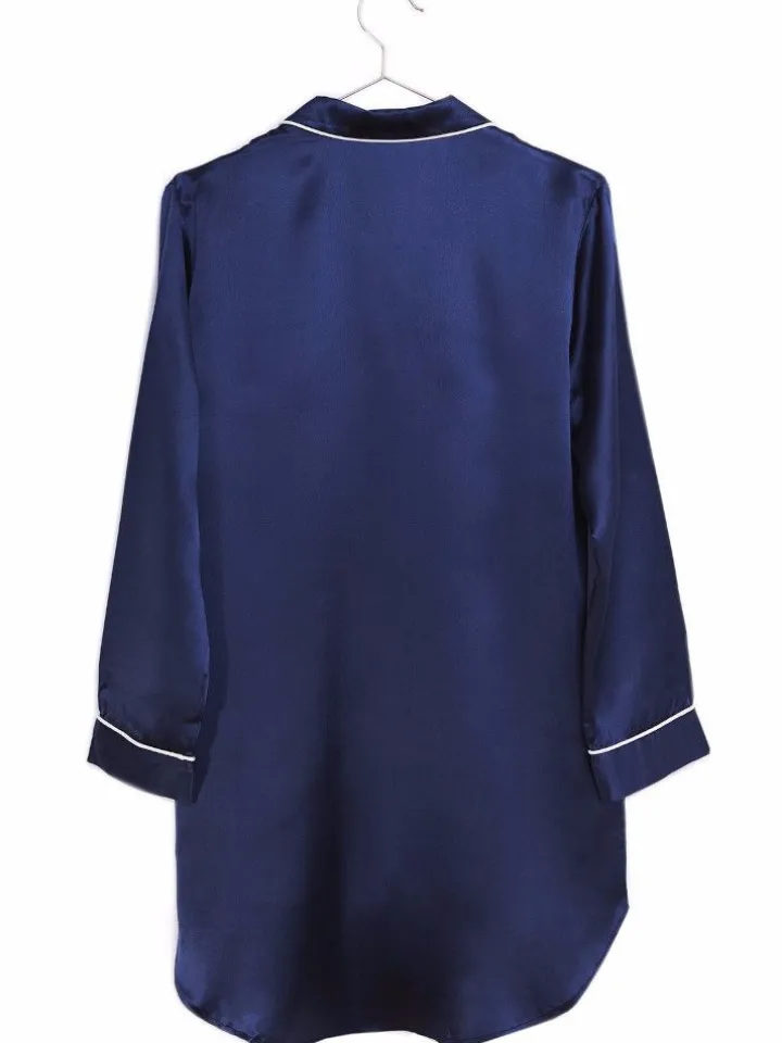 Der Stoff ist einfarbig Dunkelblau, Hellblau oder Rosa und mit einer creme-weißen Biese kontrastierend verarbeitet. Dieses Sleepshirt mit langen Ärmeln ist ca. 85 cm lang und in den Größen XS bis L erhältlich. Vorne ist es durchgehend geknöpft mit feinen Perlmuttknöpfen und hat lange Ärmel.