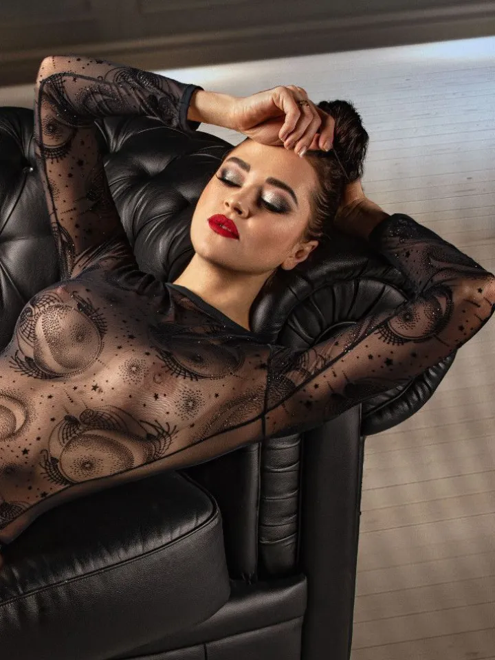 Der Body Animus von RCrescentini ist ein transparenter Body der Luxus Klasse. Der Body ist mit einem Samtmuster beflockt und mit einzelnen Glitzerpartikeln verziert. Die Rändern haben eine Satineinfassung und der Body kann im Schritt mittels eines Knopfverschlusses geöffnet und geschlossen werden. Dieser Dessous ist aus der limitierten Dessous-Serie „Fascinum Private Collection“ des italienischen Luxus Lingerie Labels RCrescentini. Die RC Private Collection umfasst nur begrenzt verfügbare Dessous mit verführerischem Design.