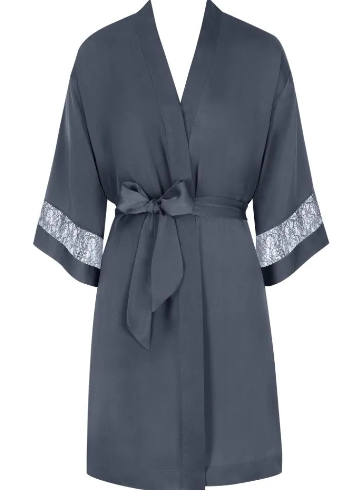 Der Morgenmantel aus der Kollektion Chemises von Triumph hat eine Gesamtlänge von ca. 98 cm und ist in den Größen 36 bis 42 in sturmgrau (Grauton mit Blau-Anteil) erhältlich.