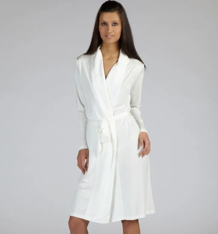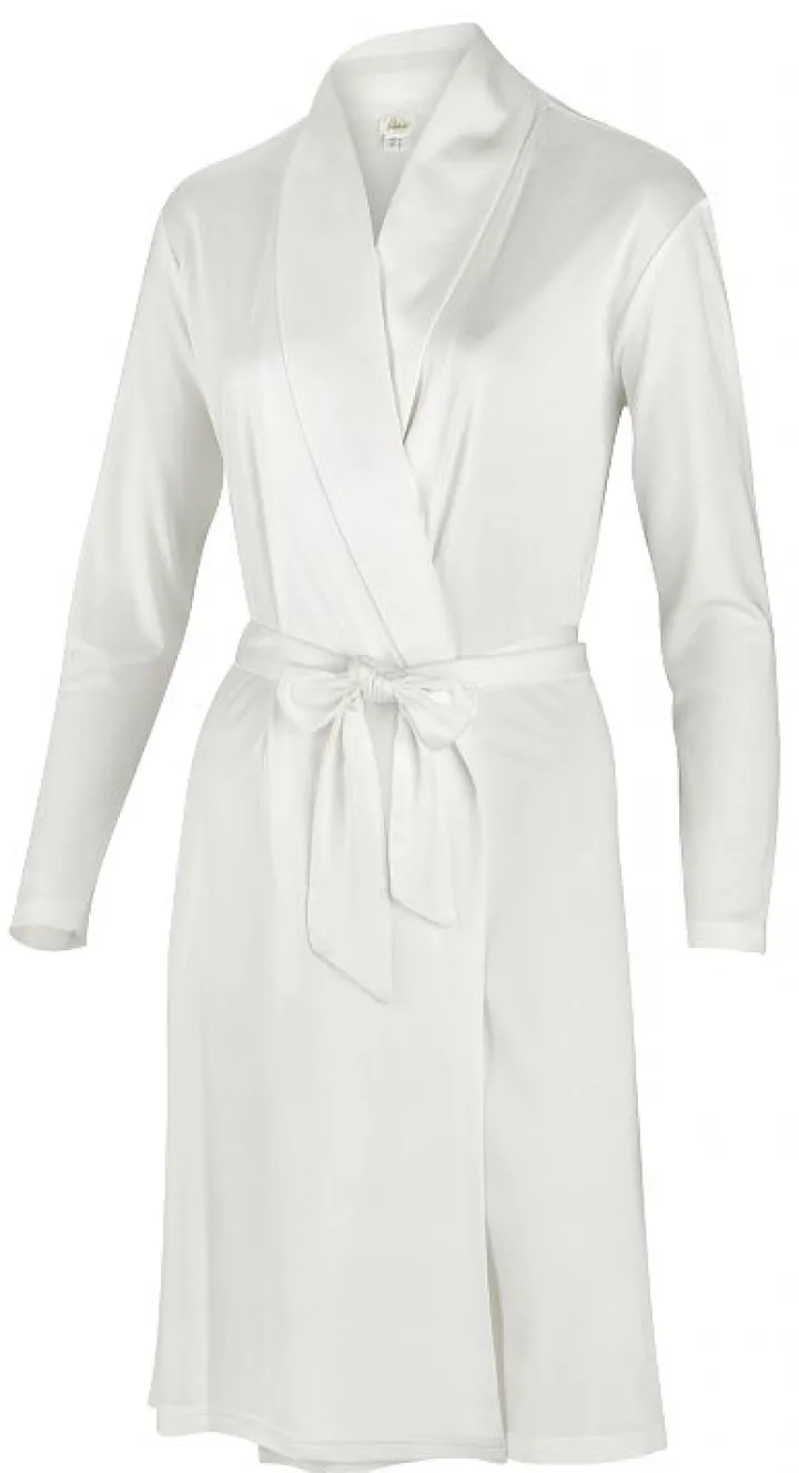 Dieser kurze Wickelmantel mit Bindegürtel ist die optimale Ergänzung zu den Nachthemden und Seidenwäsche- Teilen der Gattina Kollektionen Moyenne, Tahiti, Andaman und Interlaken. Der Langarm- Morgenmantel ist aus fließender feiner Wirkseide (100% Seide) hergestellt. Das trageangenehme Material mit einem Flächengewicht von 150 g/m² trägt sich wie feiner Jersey, ist durch die spezielle Strickart aber wesentlich haltbarer.