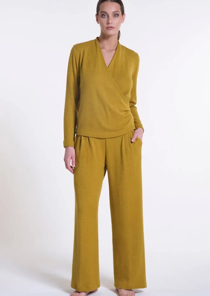 Der Lounge-Anzug hat lange Ärmel. Das Oberteil ist im Wickellook gestaltet und die Hose hat weite Beine und einen Gummibund. Der Anzug ist eine wärmende Loungewear für jede Jahreszeit kann aber auch als Tagbekleidung in verschiedenen Kombinationen getragen werden. Er ist bei uns in der Farbe Senf Gelb erhältlich.
