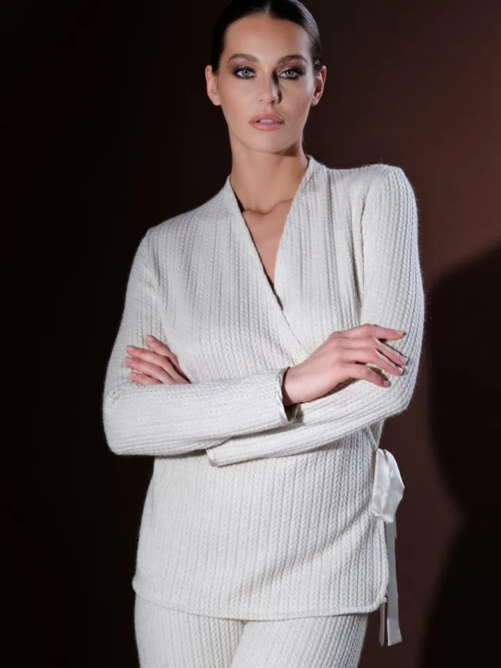 Der Lounge-Anzug hat lange Ärmel. Das Oberteil wird gewickelt getragen, mit einem Bindegürtel geschlossen und die Hose hat weite Beine und einen Gummibund. Der Anzug ist eine wärmende Loungewear für jede Jahreszeit kann aber auch als Tagbekleidung in verschiedenen Kombinationen getragen werden. Er ist bei uns in der Farbe wollweiß meliert erhältlich.