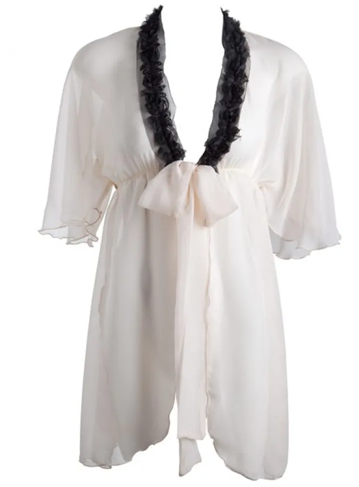 Die kurze Seiden- Robe aus Seiden-Chiffon ist am Kragen umlaufend mit gefalteten „Blumen“ aus Seidenchiffon besetzt. Zur Stabilisierung wurde hier ein hauchzarter Tüllstreifen unterlegt, welcher die Applikation zusätzlich optisch hervorhebt. Ansonsten ist die Robe komplett aus dem transparenten Chiffon aus reiner Seide gefertigt.