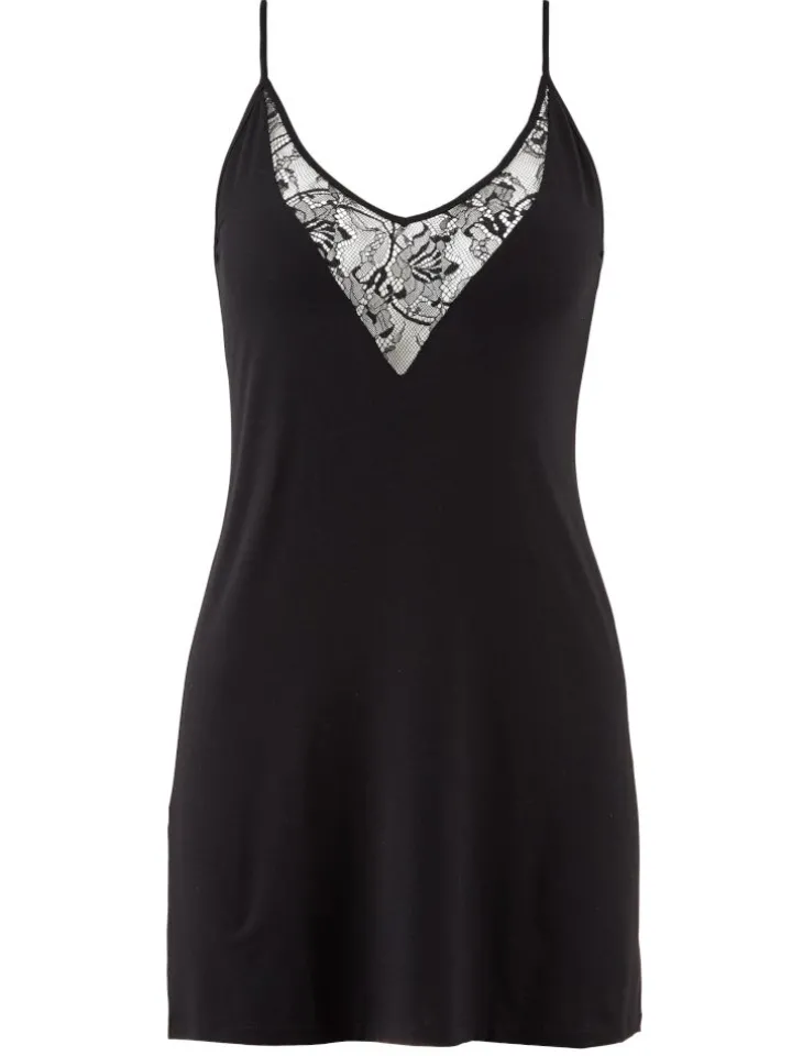 Das elegante Nachtkleid hat einen tiefen V-Ausschnitt, welcher durch einen transparenten Spitzeneinsatz stilvoll die Haut enthüllt. Die feinen Spaghettiträger, sowie der tiefe Rückenausschnitt verhleihen dem Nachthemd eine elegante Zartheit. In Kombination mit der floralen Spitze am Ausschnitt und dem hochwertigen Stoff wird ein Negligé geschaffen, welches sowohl komfortabel, als auch verführerisch ist.