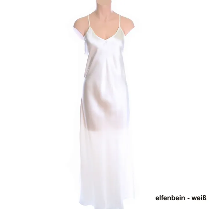 Das lange Seidennegligé hat ca. 140 cm Gesamtlänge. Rückseitig sind die Träger in der Mitte zusammengeführt, wodurch das Herabrutschen von den Schultern verringert wird. Die zierlichen Spaghetti-Träger sind in der Länge verstellbar.
