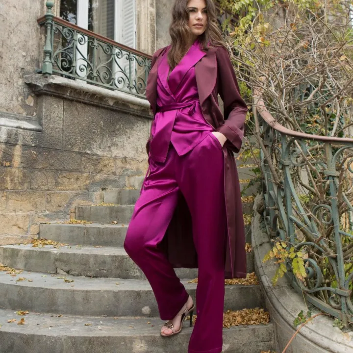 Der mittellange Seidenmorgenmantel Soie Unie der französischen Luxus-Marke Marjolaine ist aus aubergine-farbenem, glänzendem Seidensatin (100% Seide) gefertigt. Das edle Material fällt weich und fließend und ist angenehm auf der Haut. Das Revers und der Gürtel sind mit einer kontrastfarbenen Biese in der Farbe beere-violett benäht.