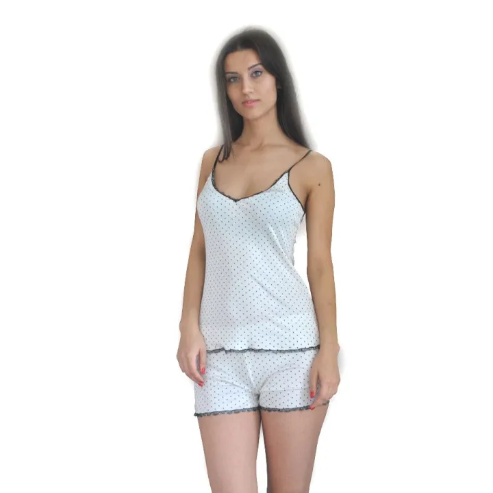Das Decolleté und der untere Saum des Spaghettiträger- Oberteils in der Grundfarbe weiß sind mit schmaler schwarzer Spitze, passend zu den Punkten, gesäumt. Die verstellbaren Träger bestehen aus Satin. Die dazugehörende Shorts hat einen bequemen Gummibund. Mit der schmalen Spitze gesäumte Beinausschnitte machen das Design des Damen- Pyjamas harmonisch.