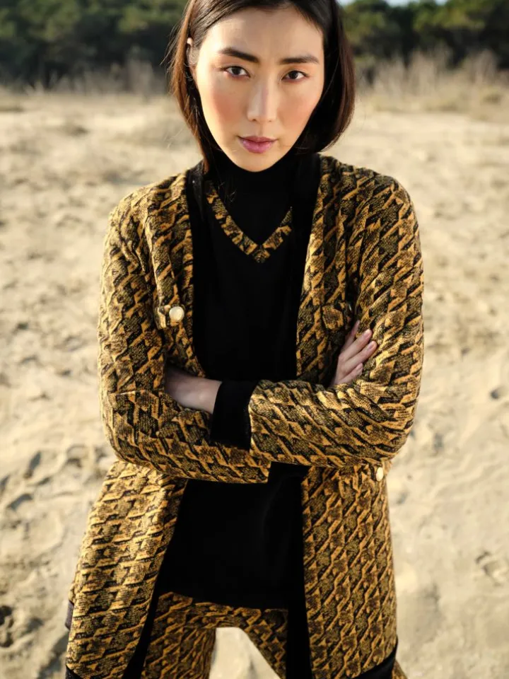 Das Loungewear-Set mit langen Ärmeln und Beinen ist in einer goldgelb / schwarz Farbkombination erhältlich. Das Oberteil ist ca. 65 cm lang und hat lange Ärmel, welche am Bündchen mit dem selben Velourstoff abgesetzt sind, aus dem die Hose gefertigt ist. Durch den Bund des Oberteils ziehen sich samtige Bändel in Saffrangelb, welche zum Verstellen der Bundweite, sowie der Verzierung dienen. Die Besonderheit dieses Lounge-Sets besteht in der aufregenden Zusammensetzung von Ober- und Unterteil. Durch die goldgelben Aktzente am Pullover, wie etwa die Bündchen und Bändel, wird eine spannende Verbindung zur Hose geschaffen. Die Hose hat ein Gelb/Schwarzes Muster, besitzt einen elastischen Gummizug und ein weites Bein. Dieser modische Hausanzug ist optimal für die Übergangszeit so wie den Winter und kann als Homewear oder auch als Reise- und Freizeitbekleidung getragen werden.