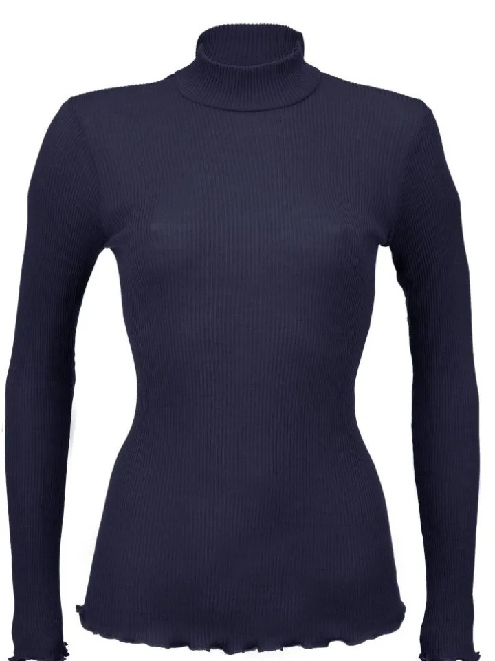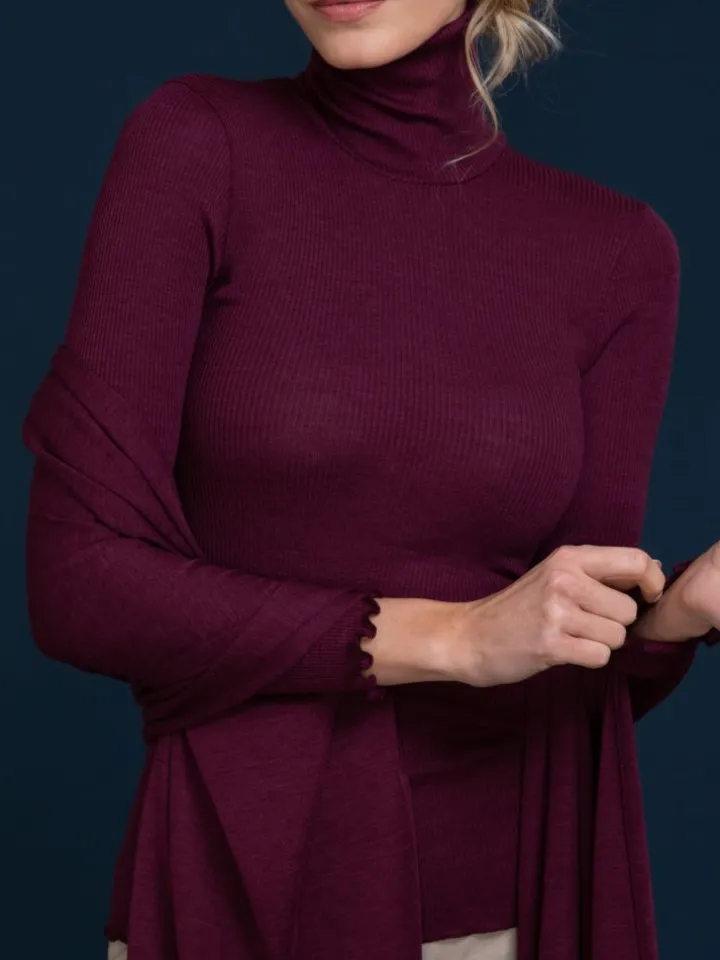 Das feine Rollkragen-Shirt Wolle-Seide besteht aus einem besonders hochwertigen, rundgestrickten und gerippten Jersey aus 70% extrafeiner Merinowolle und 30% Seide. Dieses edle Shirt mit langen Ärmeln ist ca. 60 cm lang. Der untere Saum und die Ärmelenden sind wellig umkettelt. Das Shirt hat einen hohen Rollkragen, den man auf der gewünschten Höhe umschlagen kann. Das Material ist eine rundgestrickte „Schlauchware“ und daher ist dieses Shirt seitlich nahtlos.
