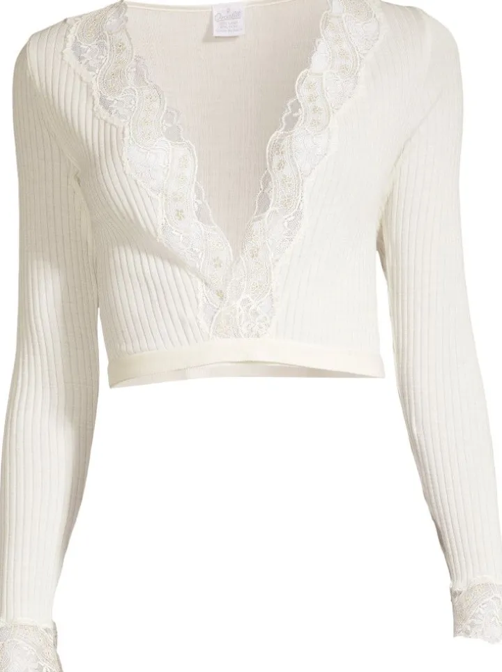 Die kurze Strickjacke Wolle-Seide besteht aus einem besonders hochwertigen, breit geripptem Jersey aus 70% extrafeiner, tasmanischer Merinowolle und 30% Seide in Kombination mit echter französischer Caudry Spitze aus Calais. Diese edle Strickjacke wird gewickelt getragen und mit einem breiten Bindeband gebunden. Die Gesamtlänge ist ca. 38 bis 40 cm.