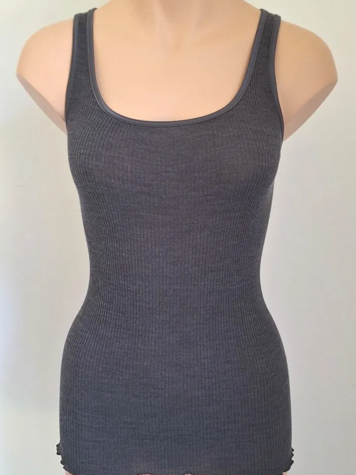 Das Camisole Top Wolle-Seide besteht aus einem besonders hochwertigen gerippten Jersey aus 70% extrafeiner Merinowolle und 30% Seide in Kombination mit einer glänzenden Satin-Bordüre. Dieses edle Träger-Top hat keine Ärmel und eine Gesamtlänge von ca. 60 cm. Das Decolleté und die Träger sind mit einer glänzenden Satin-Bordüre eingefasst, der untere Saum ist wellig umkettelt.