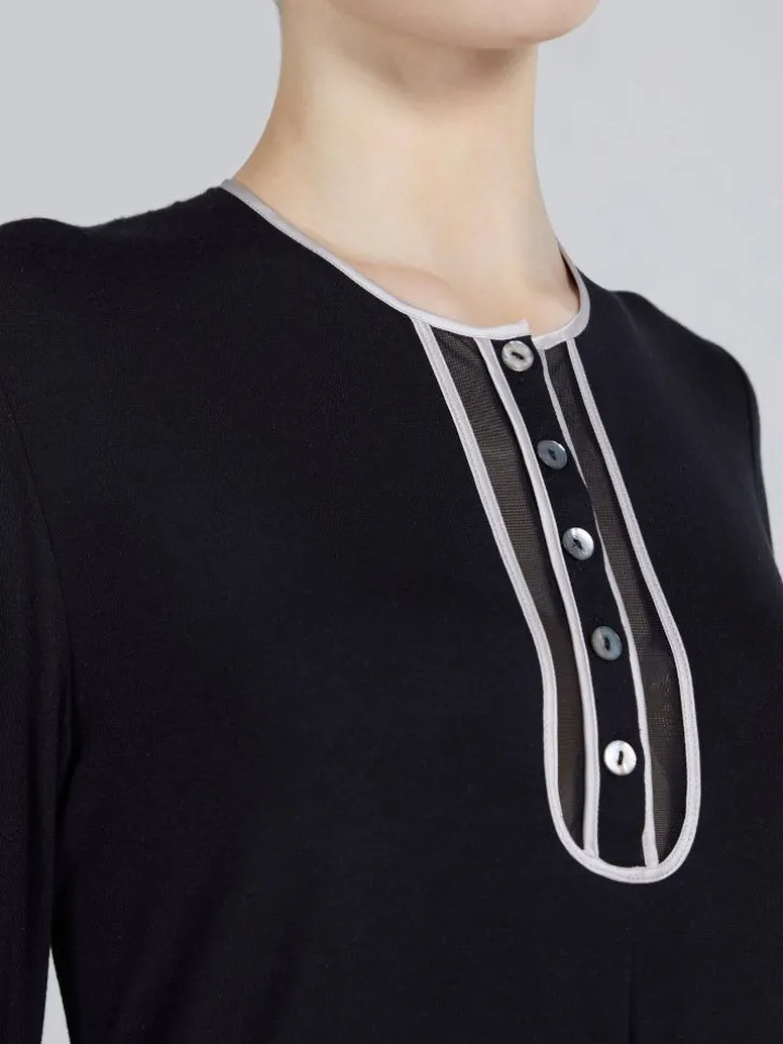 Das halb-lange Nachtkleid WKND No. 3 schwarz-puder von Verdiani Weekend besteht aus weichem Micro-Modal in einer hautsympathischen, elastischen Jersey-Qualität (92% Modal, 8% Elasthan). Es ist Made in Italy und in den Größen 36 bis 44 erhältlich. Dieses bezaubernde Nachtkleid ist ca. 95 cm lang. Es hat lange Ärmel. Das Decollete ist mit Kontrastnähten gestaltet und hat eine kurze Knopfleiste mit Perlmutt Knöpfen.