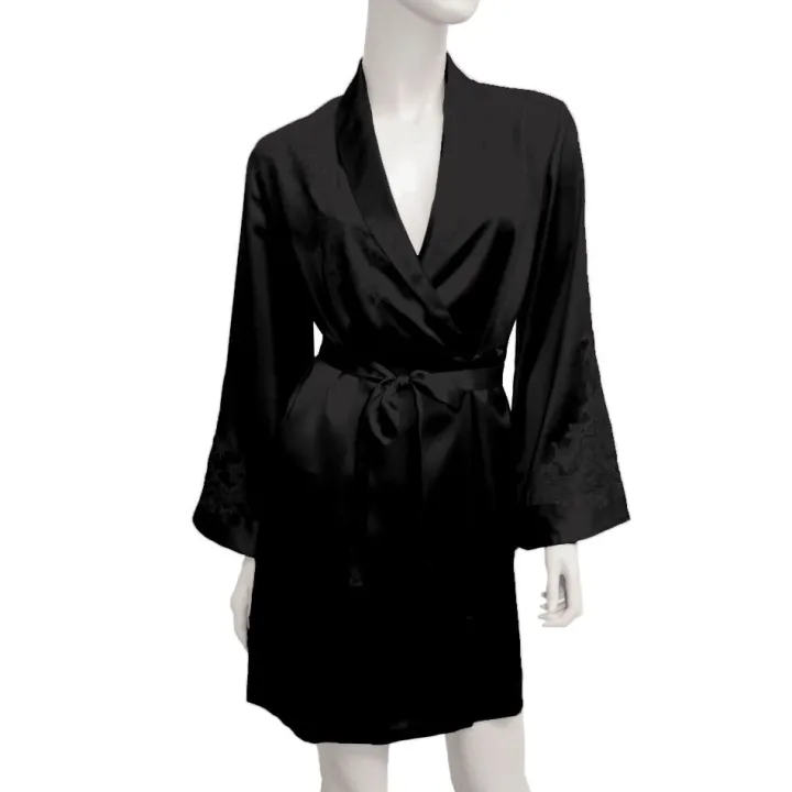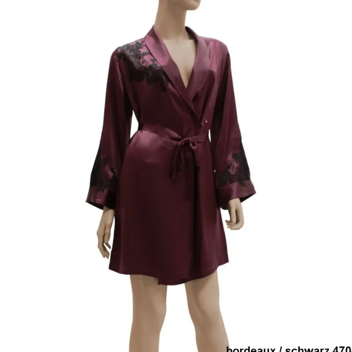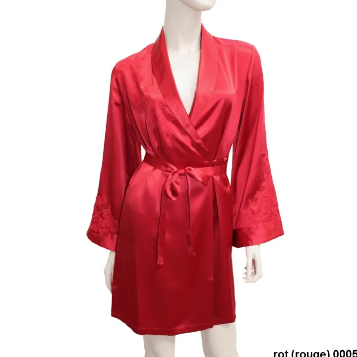 Dieser kurze Seiden-Morgenmantel ist ca. 90 cm lang und hat lange Ärmel.