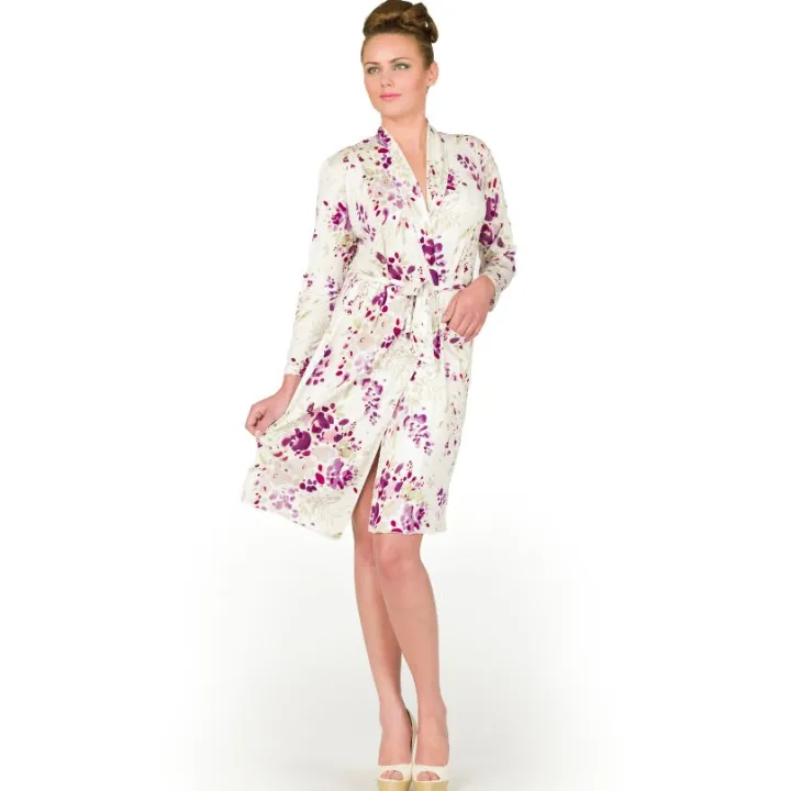 Dieser kurze Morgenmantel mit flieder-lila Blumendruck ist aus feingestricktem Seidenjersey (60% Seide, 40% Viscose) hergestellt. Das Material fällt fließend und hat ein Flächengewicht von 150 g/m². Nachtwäsche aus Seidenjersey ist optimal für Damen, die die Vorzüge der Seide schätzen, aber eine Alternative zum glatten Seidensatin suchen. Da Jersey-Seide zudem kaum knittert, ist diese Nachtwäsche auch auf Reisen bestens geeignet. Wirkseide Feinjersey ist atmungsaktiv, hautsympathisch und zu jeder Jahreszeit angenehm.