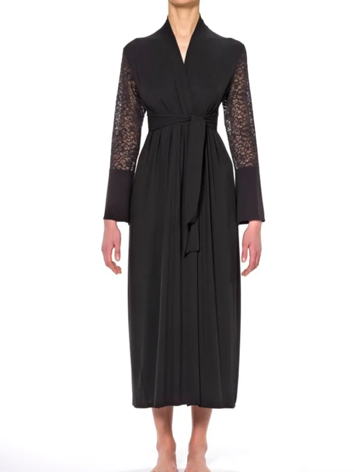 Der Morgenmantel Jasmine ist in der Farbe schwarz und in den Größen 1 bis 6 erhältlich.