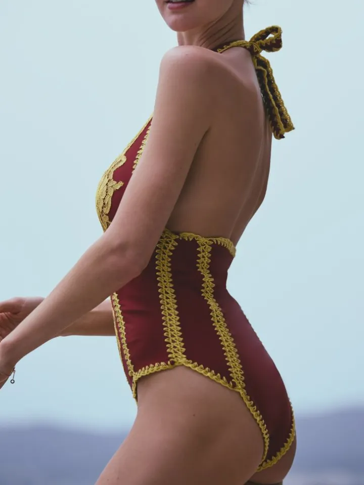 Mit Spitze verzierter Badeanzug Aphrodite No. 1 in bordeauxrot von Marjolaine