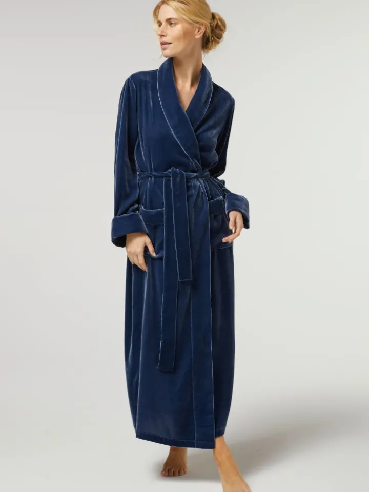 Dieser kuschelige, lange Samt-Morgenmantel ist aus einem ganz besonderen Material gefertigt: Kuscheliger Samt (82% Viscose, 18% Seide) ist zu einem wunderschönen Winteraccessior mit bequemem Schnitt geworden. Der lang geschnittene Samtmantel wird gewickelt getragen und mit einem Bindegürtel geschlossen. Er hat einen Reverskragen, ist ca. 140 cm lang und hat auf beiden Seiten Manteltaschen aufgenäht.