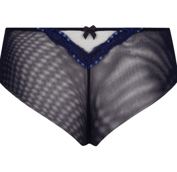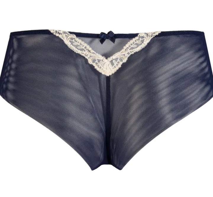 Der bezaubernde Slip ist vorne aus feiner Seide und besticktem Tüll. Die Seiten und die Rückseite sind komplett aus Tüll und daher leicht transparent. Hinten ist eine kleine Stickerei V-Förmig angebracht, um mehr Form und Linie in den Slip zu bringen. Diese Detail ist zusätzlich mit einer zarten Zierschleife versehen. Der Slip ist in knapper Panty/Shorty Form geschnitten und erzeugt somit einen frechen und zugleich verführerischen Look. Das Panty hat einen weichen Baumwollzwickel. Der aufregende Schnitt, die hochwertigen Materialien und zarten Details machen aus diesem Slip ein aufregendes, unwiderstehliches Wäscheunterteil, dass sowohl für den Alltag als auch für besondere Anlässe perfekt geeignet ist. Aus dieser zarten Kollektion gibt es weitere, ergänzende Kombinationsteile seperat in unserem Shop.
