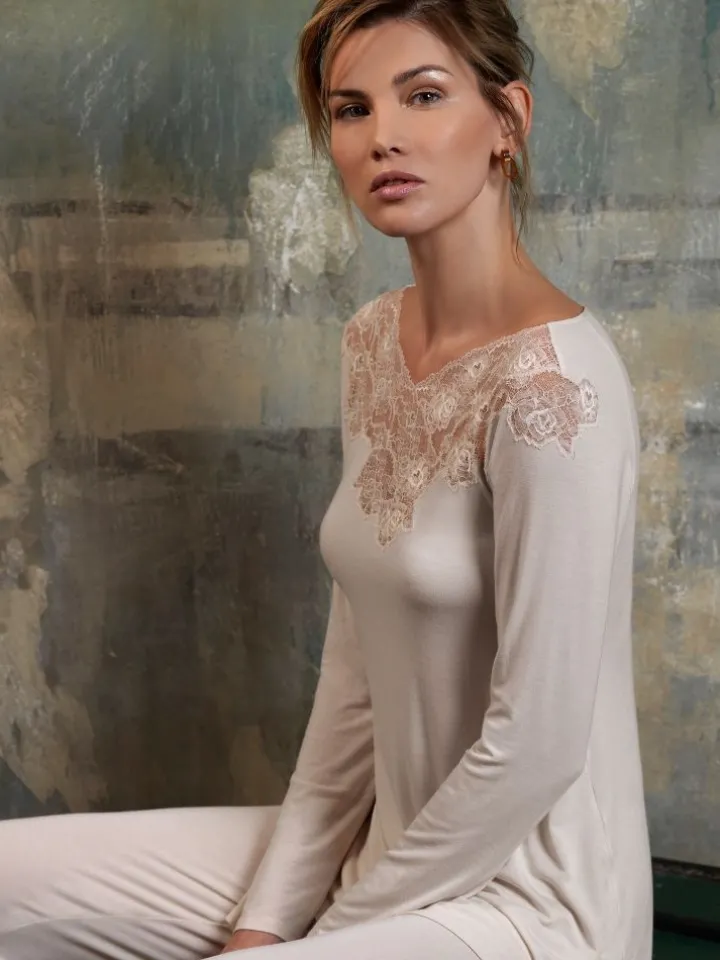 Der Pyjama Cloe hat ein Oberteil mit langen Ärmeln und weitem Ausschnitt. Der Ausschnitt ist mit einer floralen Spitze gearbeitet. Die im Lieferumfang enthaltene Hose ist lang geschnitten und hat einen Gummibund.