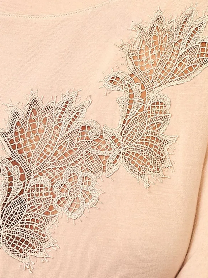 Der Pyjama Giselle hat ein Oberteil mit langen Ärmeln und rundem Ausschnitt. Das Oberteil ist mit einer Spitze im floralen Design verziert. Die im Lieferumfang enthaltene Hose ist lang geschnitten und hat einen Gummibund.