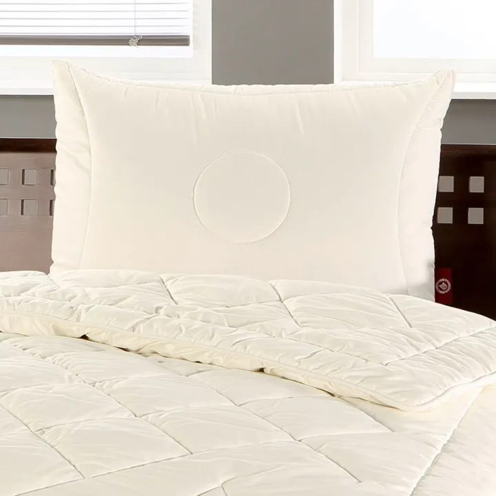 Die Hülle besteht aus einem cremefarbenen Satin aus 100% Baumwolle, welcher auf ein Vlies aus Schafwolle mit Zirbenflocken versteppt ist. Durch die natürlichen Materialien in Bezug und Füllung bietet dieses Kissen ein besonders angenehm klimatisiertes Schlafklima. Es ist vom Schlafkomfort her eher fester als Feder-Daunenkissen.