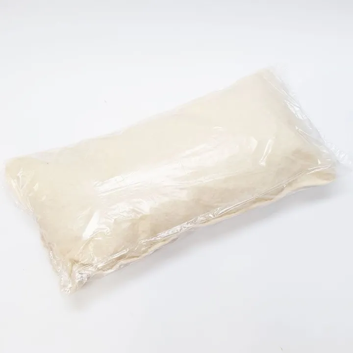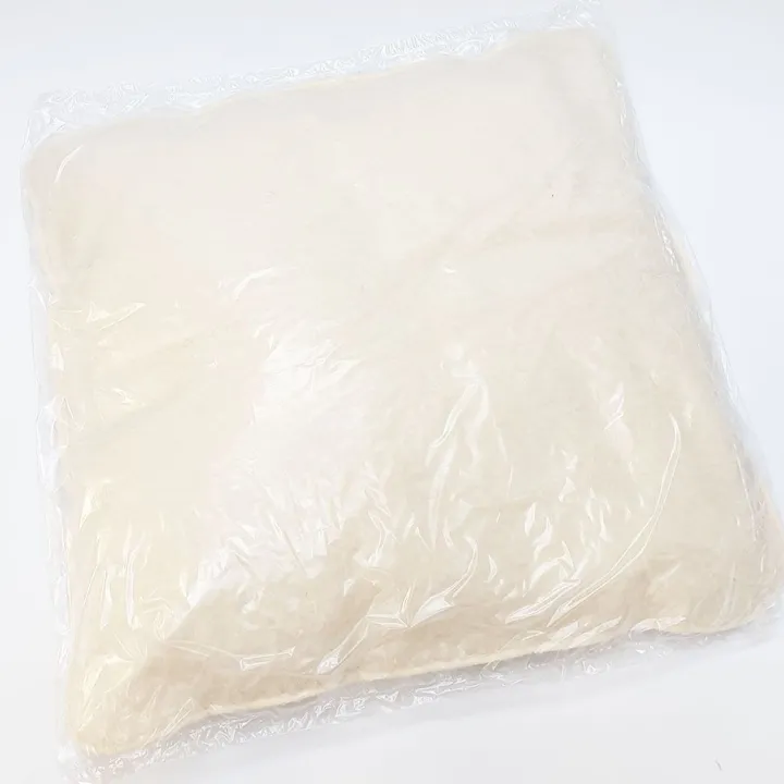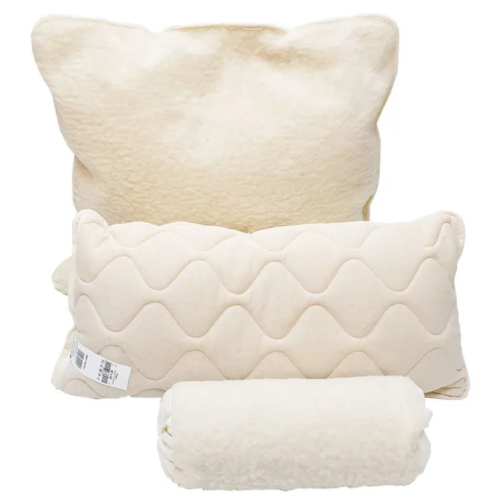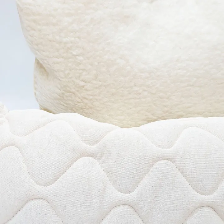 Die Hülle besteht auf der Vorderseite aus gewebten Schafwoll-Lammflor, welches wärmend, temperaturausgleichend und feuchtigkeitsregulierend wirkt. Die Rückseite besteht aus cremefarbenem Baumwolljersey, der auf Schafwollvlies versteppt ist – so kann man das Kissen je nach Temperaturbedarf wenden. Die Zufüllung besteht aus Schafwollvlies – dadurch ist das Kissen vom Schlafkomfort her eher fester als Feder-Daunenkissen.