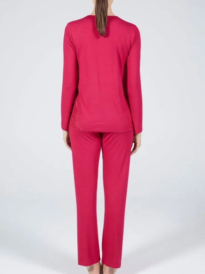 Der lange Pyjama Lampone No. 2 von Verdiani besteht aus weichem Micro-Modal in einer hautsympathischen, elastischen Jersey-Qualität (92% Modal, 8% Elasthan). Er ist Made in Italy und in den Größen 38 bis 46 erhältlich. Der Damen Pyjama hat lange Ärmel und eine kurze Knopfleiste mit Perlmuttknöpfen. Das Oberteil ist seitlich mit Spitze verziert, ca. 65 cm lang und die lange Hose hat einen Gummibund.