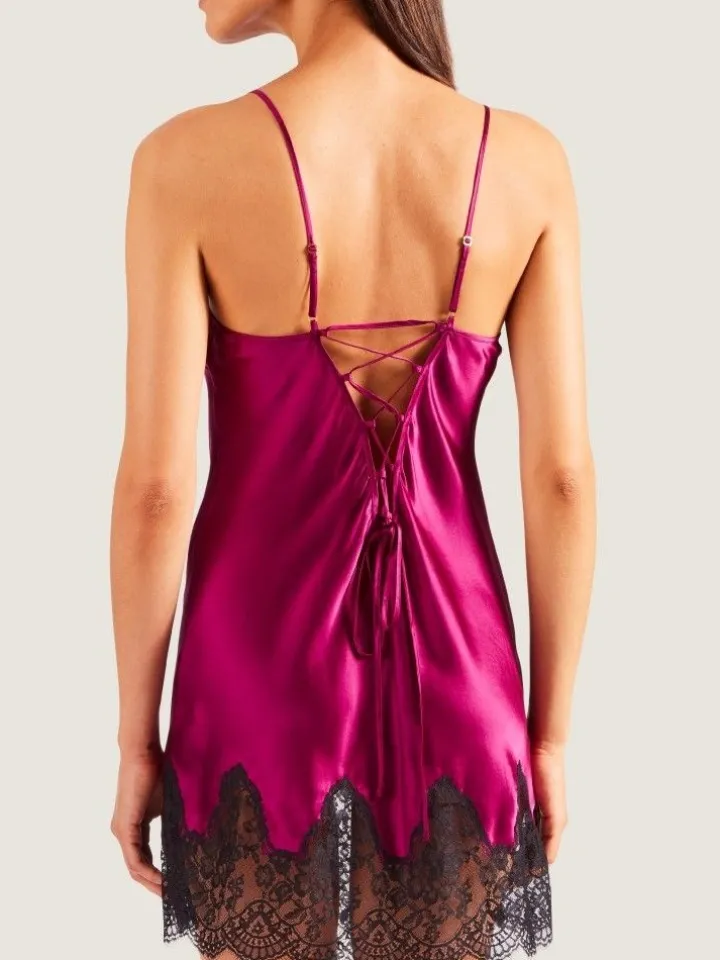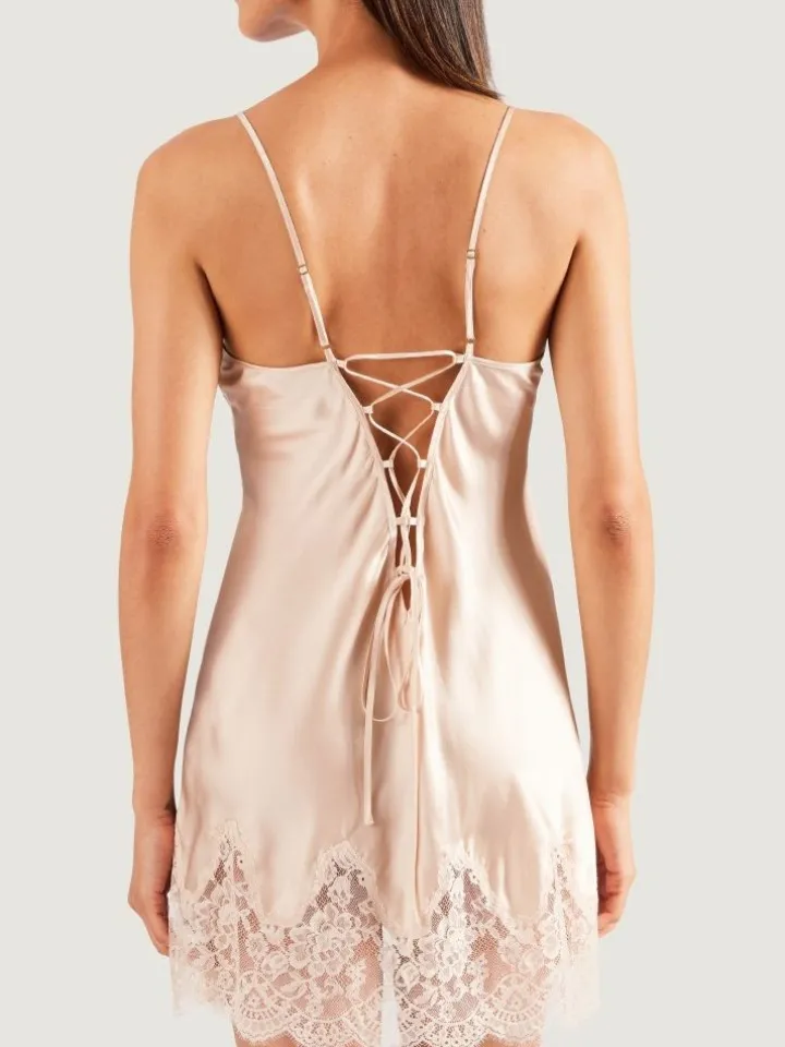 Das Negligé ist am Decolleté und zusätzlich am Saum umlaufend mit der weichen Spitze benäht. Durch die feine Verarbeitung und den körpernahen Schnitt ist dieses Modell auch als Unterkleid tragbar. Im Rücken hat dieses kurze Seidennegligé einen Schnüreinsatz und ist daher etwas in der Weite anpassbar.