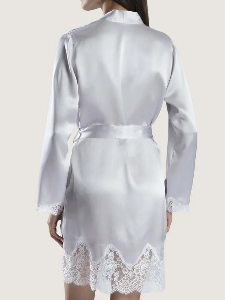 Der Kimono ist an den Ärmelenden und am unteren Saum mit Spitze besetzt. Er wird gewickelt getragen und hat einen Bindegürtel aus Seide. Der Seiden-Kimono ist ca. 100 cm lang und hat lange Ärmel. Unten hat er einen ca. 15 cm breiten Spitzensaum aus inkrustierter Spitze. Diese edle Seidenwäsche ist die perfekte Ergänzung zu den separat erhältlichen Nachthemden aus der gleichen Serie und in den folgenden Farben erhältlich: