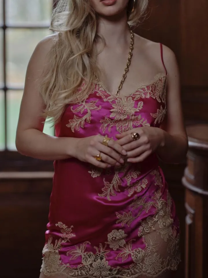 Ein besonders kurzes Nachthemd der Luxusklasse ist die Mini Combinette Victoria der französischen Edel-Marke Marjolaine. Der edle Seidensatin aus 100% Seide wurde mit exquisiter Spitze aus Calais zu einer bezaubernden Nachtwäsche verarbeitet.