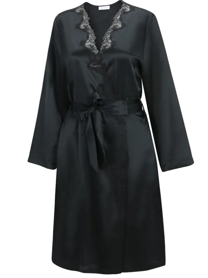 Der kurze Morgenmantel ist ca. 90 cm lang und hat lange Ärmel. Er ist eine verführerische Seidenwäsche und vielfältig kombinierbar. Das Grundmaterial dieser Serie ist der glänzende Seidensatin, den Eva B. Bitzer auch für die klassische Basis-Kollektion verwendet. So sind die Wäscheteile der Satin & Lace Serie mit den einfarbig schwarzen oder naturweißen Teilen der Klassik Kollektion kombinier- und ergänzbar.