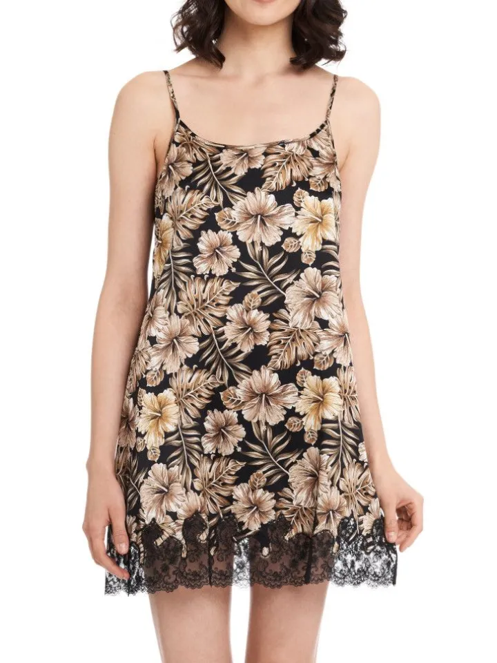 Dieses Modell in Schwarz mit Blumendruck in schoko und gold-bronze ist in den Größen 36 bis 46 (deutsche Größen) erhältlich. Das Neglige Joanna hat verstellbare Spaghettiträger und seitliche Abnäher an der Brust.