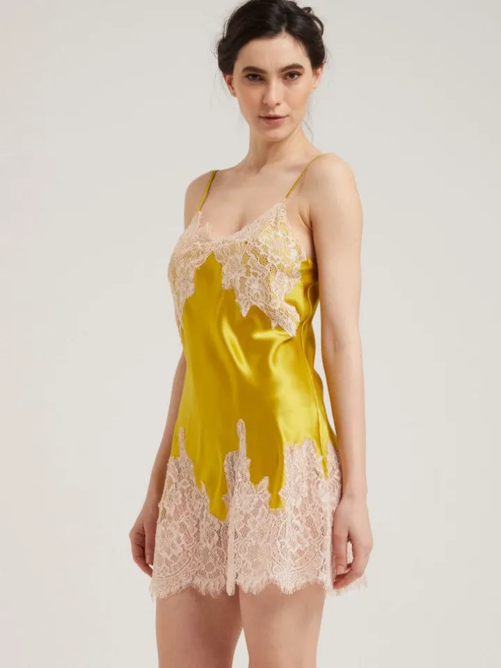 Das kurze Seidennachthemd hat fein gearbeitete in der Länge verstellbare Spaghetti-Träger und ist in der Farbe nachtblau, gold oder oceantürkis mit Spitze erhältlich.