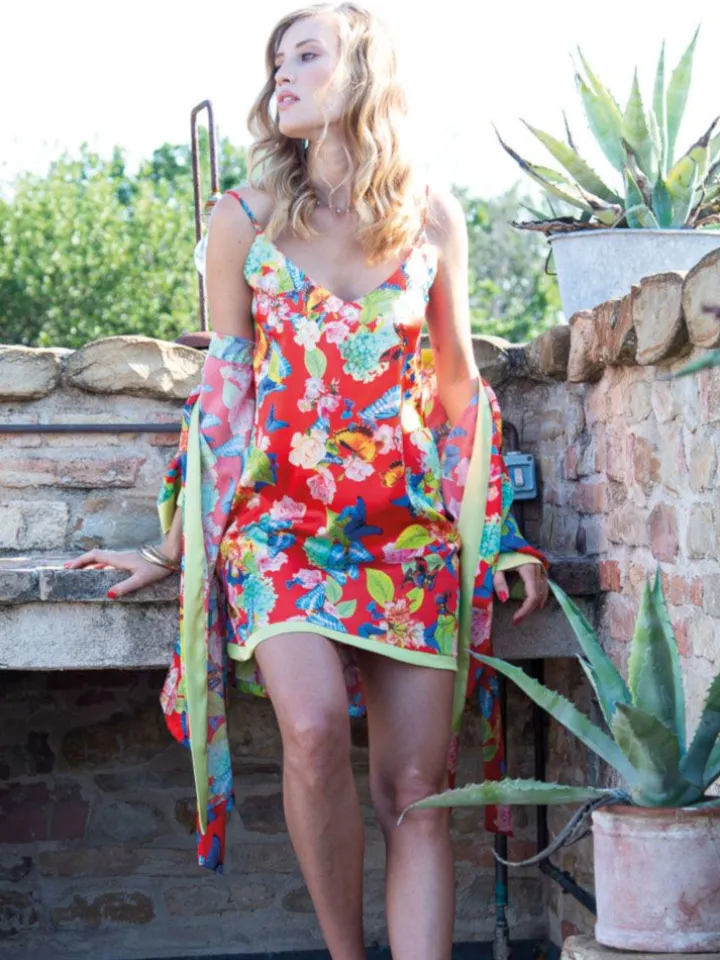 Dieses feminine Nachtkleid besteht aus Stretchseide, wodurch es leicht elastisch ist und der Tragekomfort erhöht wird. Es hat einen sommerlichen Print mit bunten Blüten und Schmetterlingen und ist in der Grundfarbe rot oder cremeweiß erhältlich.