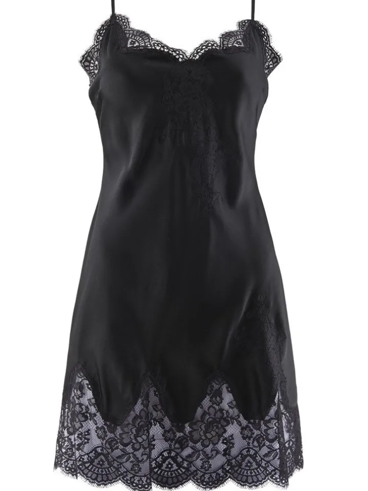 Das Negligé ist am Decolleté und zusätzlich am Saum umlaufend mit der weichen Spitze benäht. Durch die feine Verarbeitung und den körpernahen Schnitt ist dieses Modell auch als Unterkleid tragbar.