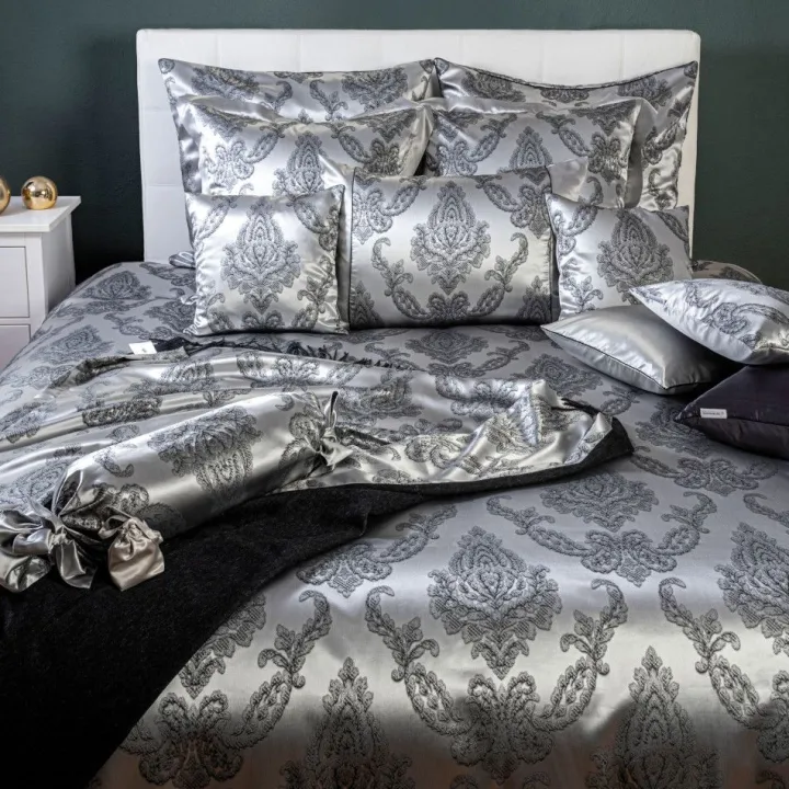 Die garngefärbt gewebte Bettwäsche Aviano Black besteht aus reiner Seide. Der edel glänzende Jacquard-Satin mit einem exclusiven Muster aus feiner Maulbeerseide ist luxuriös und elegant. Das hochwertige Gewebe aus 100% Seide fällt fließend und hat einen edlen Glanz. Bettwäsche aus reiner Seide ist hautsympathisch und temperaturausgleichend und damit sowohl im Sommer als auch im Winter angenehm. Diese Seidenbettwäsche hat ein Flächengewicht von ca. 110g/m².