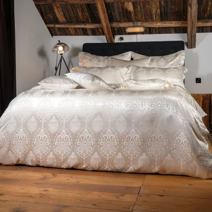 Die luxuriöse, natur-weiße Bettwäsche Damask besteht aus reiner Seide. Der edel glänzende Jacquard-Satin mit einem fürstlichen Damaszener Muster aus feiner Maulbeerseide ist stylisch und elegant. Das hochwertige Gewebe aus 100% Seide fällt fließend und hat einen edlen Glanz. Bettwäsche aus reiner Seide ist hautsympathisch und temperaturausgleichend und damit sowohl im Sommer als auch im Winter angenehm. Diese Seidenbettwäsche hat ein Flächengewicht von ca. 100g/m².