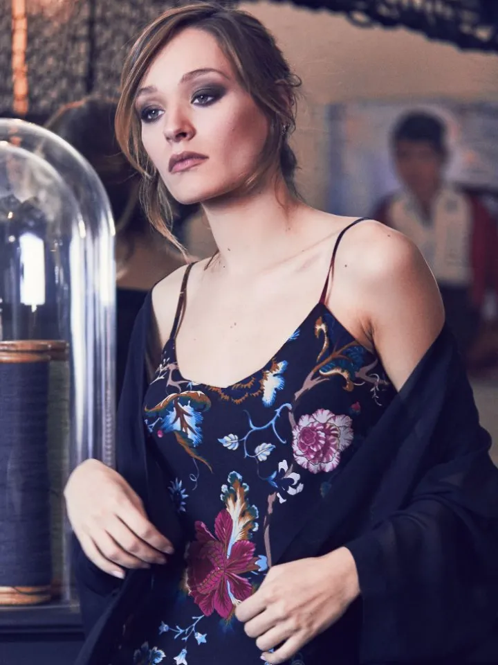 Seidenmousselin – auch als Seidengeorgette bezeichnet – ist ein feines und transparentes Seidengewebe. Die Oberfläche ist griffiger und nicht so glatt wie Seidensatin und hat ein eher seidenmattes Erscheinungsbild (kaum Glanz). Da dieser feine Stoff leicht durchsichtig ist, ist er bei dieser Kollektion doppelt verarbeitet – die Teile sind jedoch dennoch nicht komplett blickdicht.
