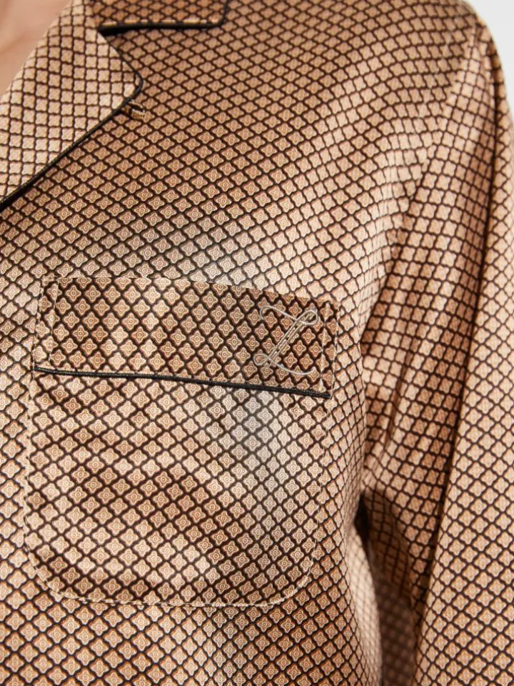 Das Oberteil des Seiden-Pyjamas ist ca. 80 cm lang und mit schönen, breiten doppelten Säumen gearbeitet. Der Revers-Kragen mit leichtem Einschnitt und der aufgesetzten Brusttasche geben dem edlen Schlafanzug seine elegante Erscheinung. Den letzten Schliff erhält der Herren-Pyjama mit den Logo-geprägten Perlmutt-Knöpfen, mit denen das Schlafanzug-Oberteil geknöpft wird. Die Pyjama-Hose ist gerade geschnitten und verfügt über einen Eingriff, der mit einem Knopf geschlossen ist.