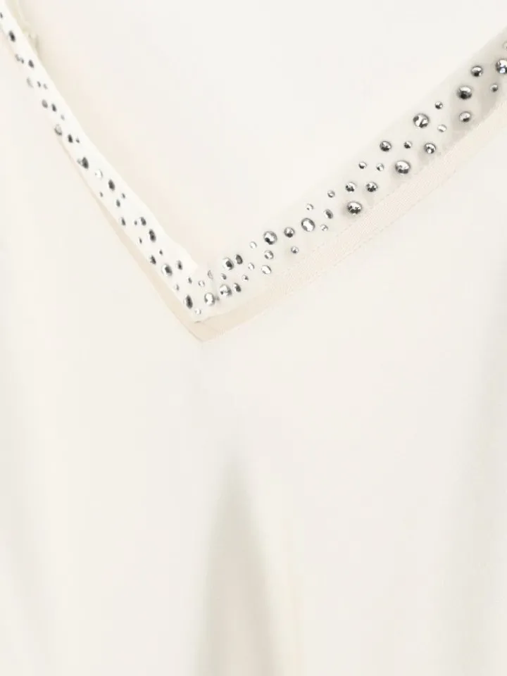 Das Seidentop Jewels mit Spaghetti-Träger besteht aus 100% Seide. Es ist vielseitig kombinierbar, ob als Seidennachtwäsche oder verführerische Damenoberbekleidung. Der V-Ausschnitt ist einem Streifen durchsichtigen Tüll abgesetzt und mit Kristallen verziert.