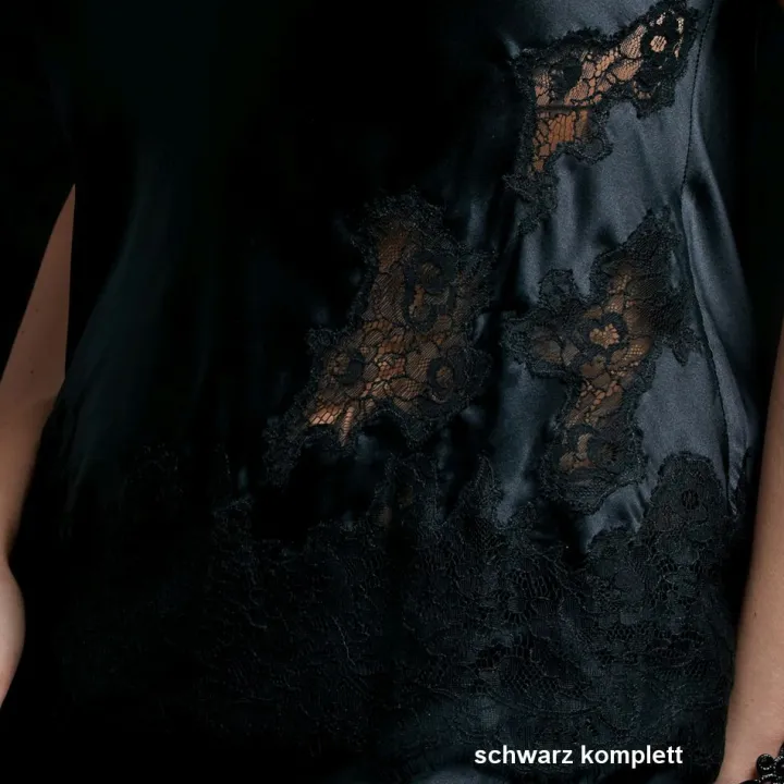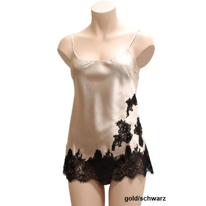 Dieses verführerische Seidentop ist aus hochwertigem, goldem oder schwarzem Stretch-Seidensatin (95% Seide) gefertigt. Das Seidentop (Länge ca. 65 cm) ist am Saum und auf der Vorderseite mit einer weichen, schwarzen Eyelash-Spitze besetzt. Die feine Spitze wurde dabei als sogenannte „inkrustierte Spitze“ in den Satin eingearbeitet. Für diese aufwändige Verarbeitungsart werden Spitze und Stoff von Hand für jedes Teil einzeln passgenau ausgeschnitten und erst dann vernäht. Das Top hat feine in der Länge verstellbare Spaghetti-Träger.