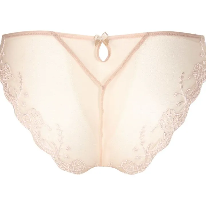 Der bezaubernde Slip ist vorne aus feiner Seide mit besticktem Tüll. Die Rückseite ist komplett aus Tüll und daher leicht transparent. Die schönen Stickereien sind sowohl vorne, als auch hinten an den Rändern des Slips angebracht. So wird ein einzigartiger Look geschaffen, der sich von einem gewöhnlichen Slip unterscheidet. Hinten ziert zusätzlich ein kleines Cut-Out mit einer zarten Zierschleife den Slip. Das Wäschenunterteil hat einen weichen Baumwollzwickel. Der schöne Schnitt, die hochwertigen Materialien und zarten Details machen aus diesem Slip ein aufregendes, unwiderstehliches Dessousteil, dass sowohl für den Alltag als auch für besondere Anlässe perfekt geeignet ist. Aus dieser zarten Kollektion gibt es weitere, ergänzende Kombinationsteile seperat in unserem Shop.